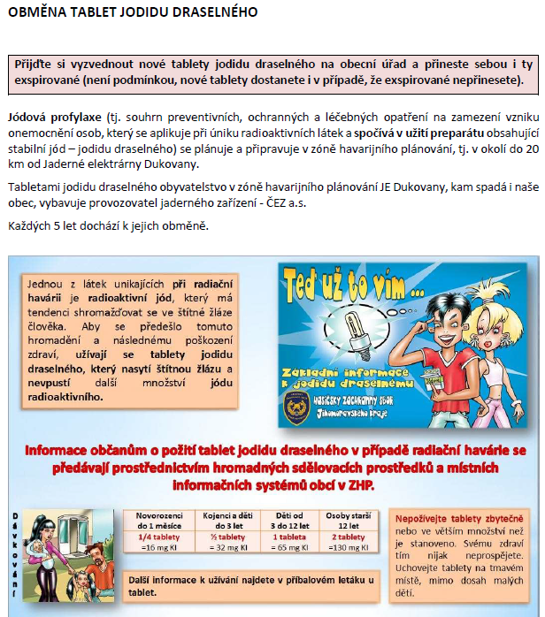 Prosíme zástupce domácnosti, případně neoslovené zástupce právnických osob a zástupce podnikajících fyzických osob, aby se dostavili do místa výdeje k převzetí balení jodidových tablet.